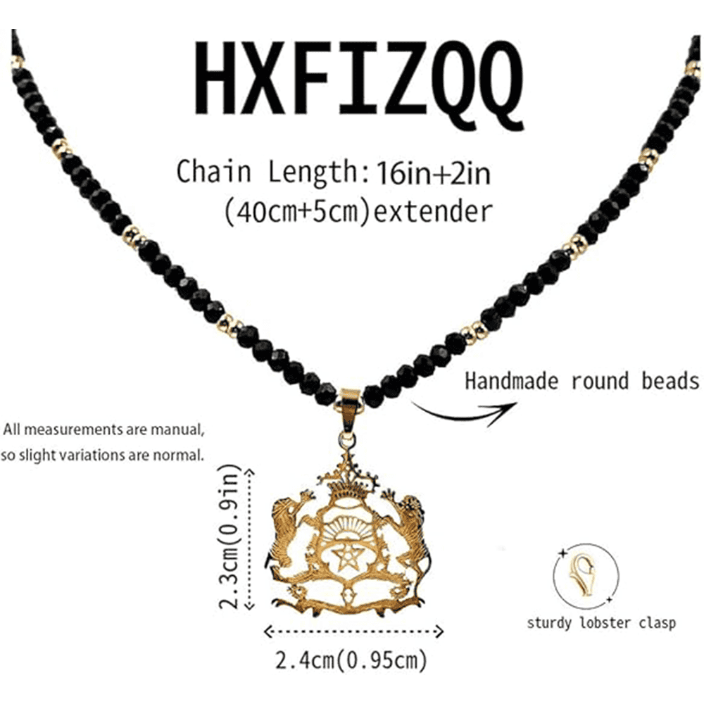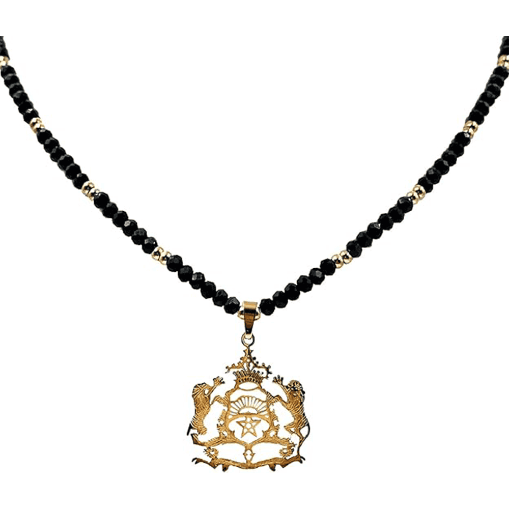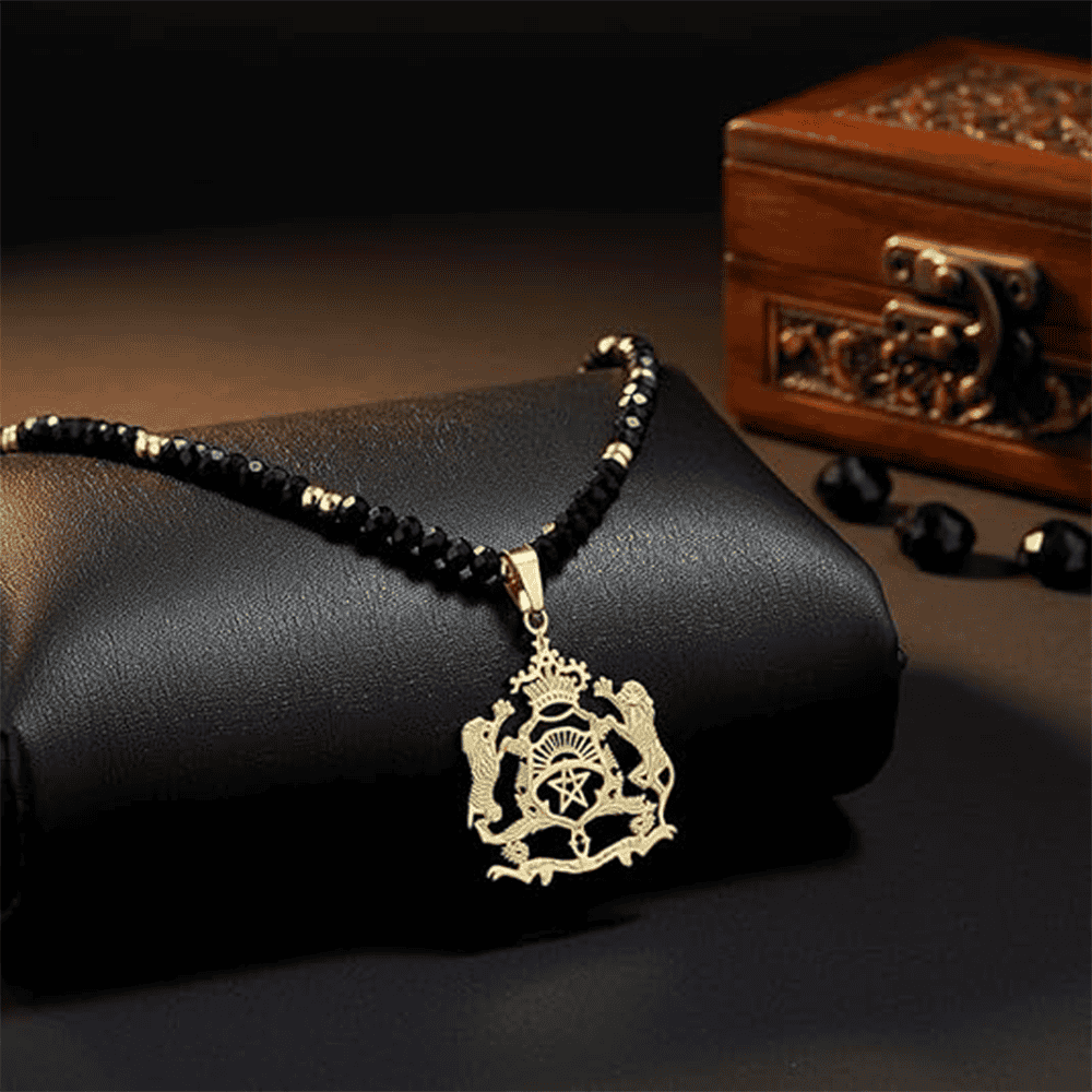 This Moroccan-style emblem pendant necklace has a bold, symbolic look that feels intentional from the first glance. The pendant design focuses on a strong royal emblem theme, featuring two detailed lions positioned on each side of a central crest topped with a crown. This type of emblem jewelry is often associated with strength, pride, leadership, and heritage-inspired fashion. The pendant is not minimal, and it is not meant to disappear under clothing. It works as a statement necklace that becomes the main focus of an outfit.