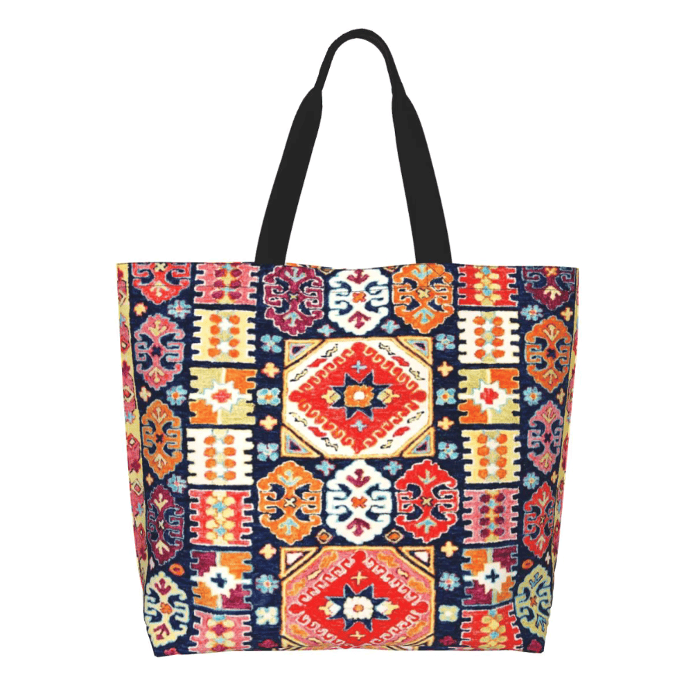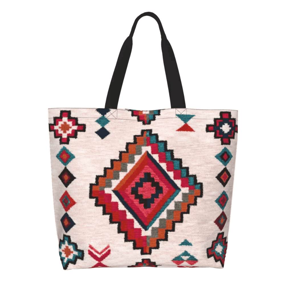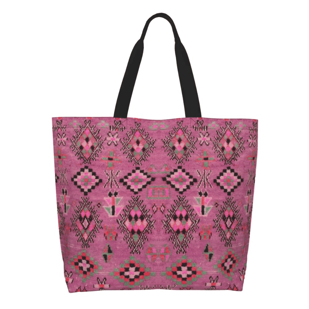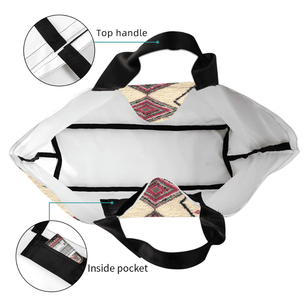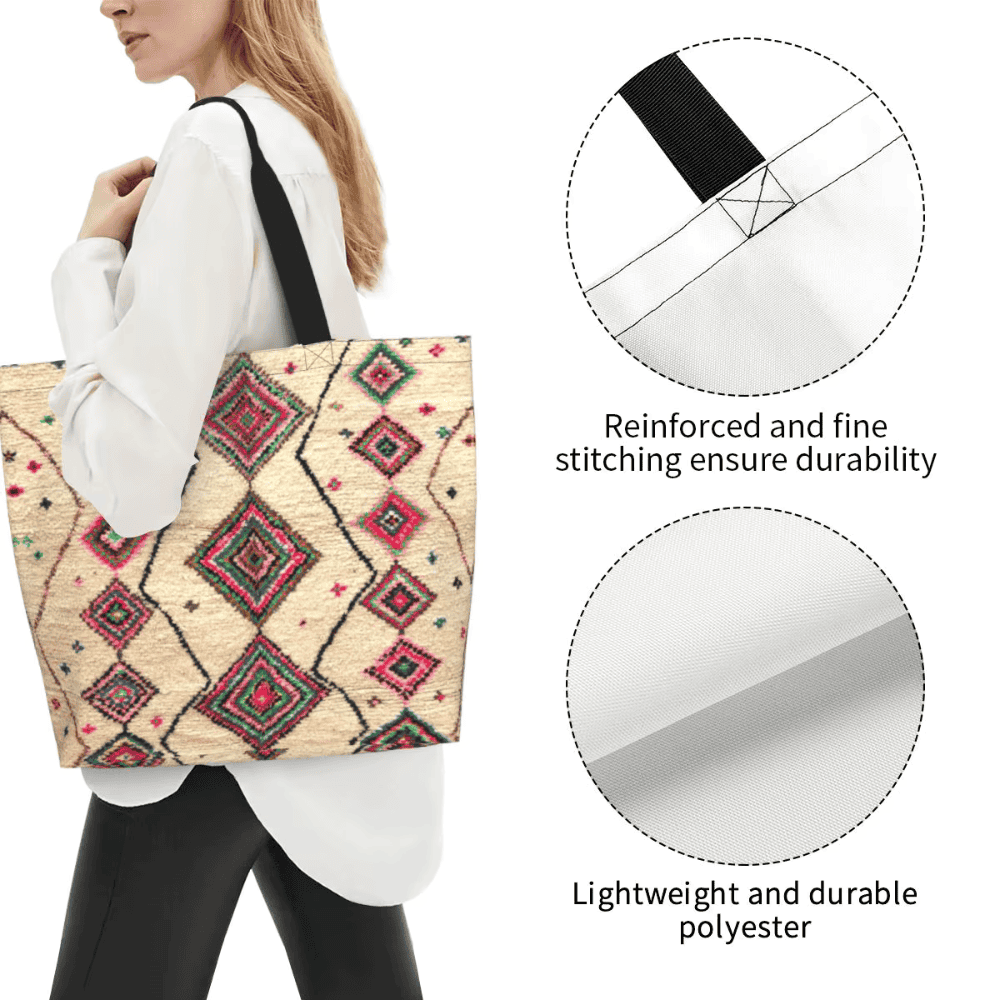 In this tote bag, the Bohemian geometric pattern is printed onto durable polyester fabric to visually resemble the surface patterns often seen in Berber rugs. The pattern adds cultural character without creating a fragile decorative surface. Instead, the pattern becomes a durable part of the bag that maintains its appearance through regular use.