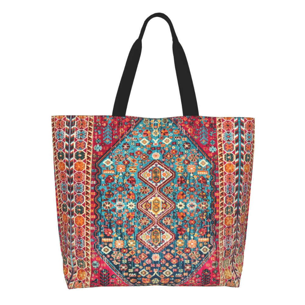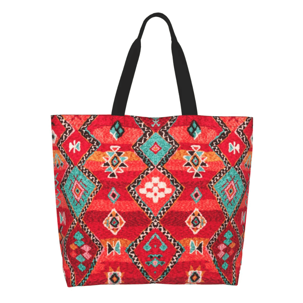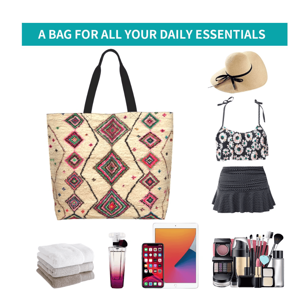 Bohemian fashion focuses on relaxed textures, artistic patterns, and expressive design elements. The geometric Berber rug pattern used on this tote bag aligns with that aesthetic while maintaining simplicity for daily use.