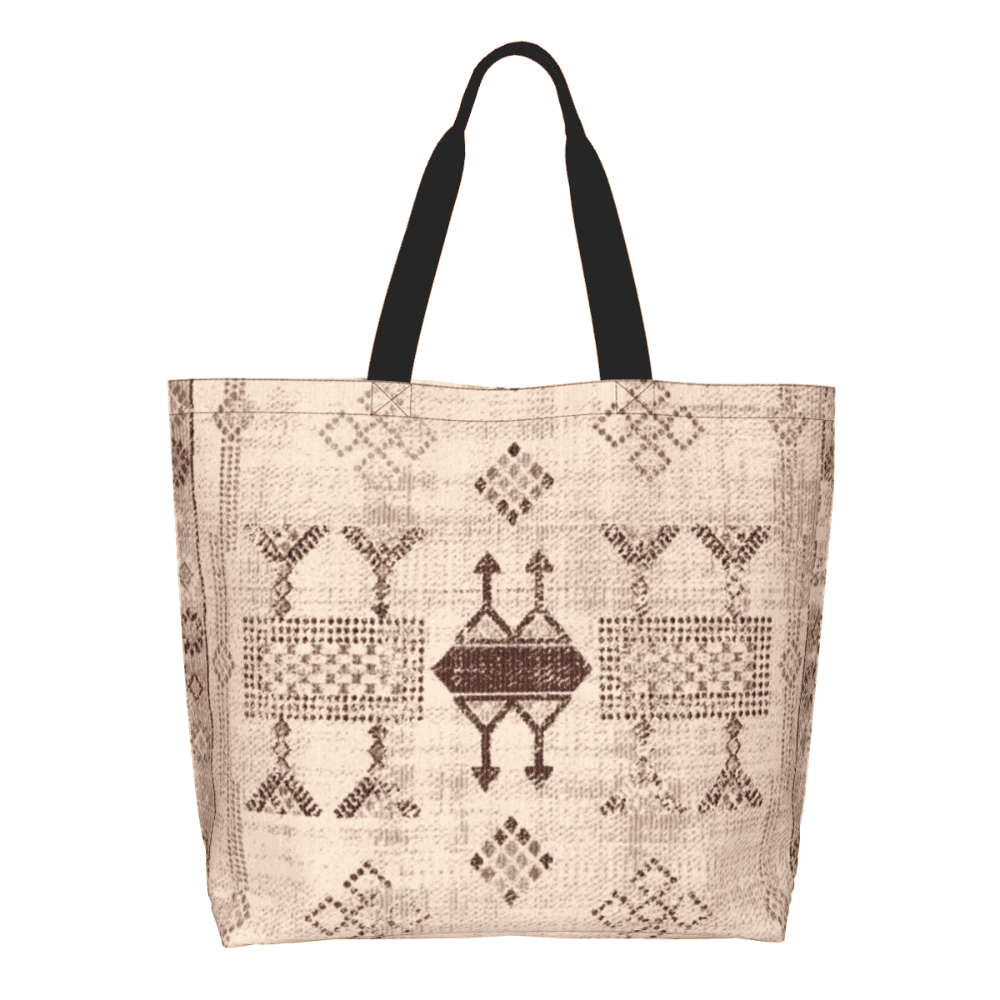 The bag therefore functions both as a useful shopping tote and a simple fashion accessory. The geometric Berber pattern distinguishes it from plain tote bags while maintaining focus on practical everyday use.