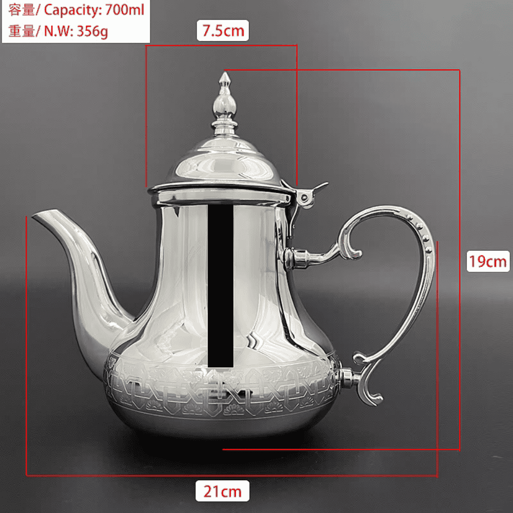 This engraved Moroccan teapot reflects traditional North African tea culture while using practical modern materials. The body is made from stainless steel, which provides durability and resistance to corrosion. Unlike fragile ceramic kettles, stainless steel handles daily use, frequent heating, and repeated washing without losing structural integrity. The engraved decorative surface adds cultural character inspired by Moroccan and Arab tea service traditions often seen in cafés and restaurants.