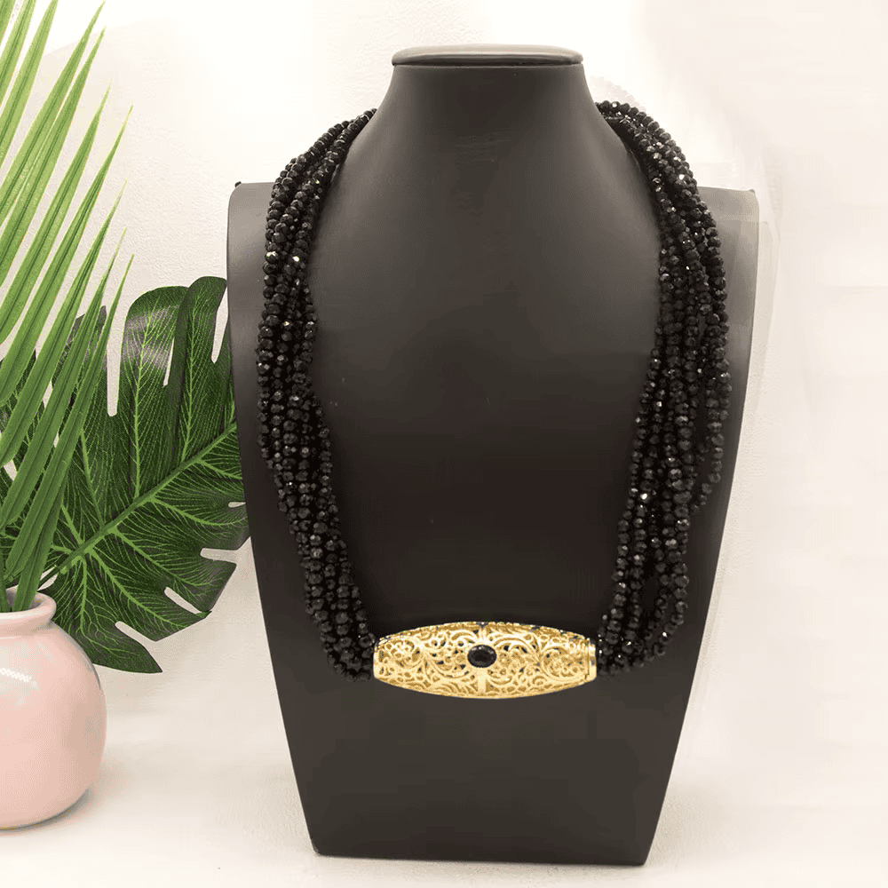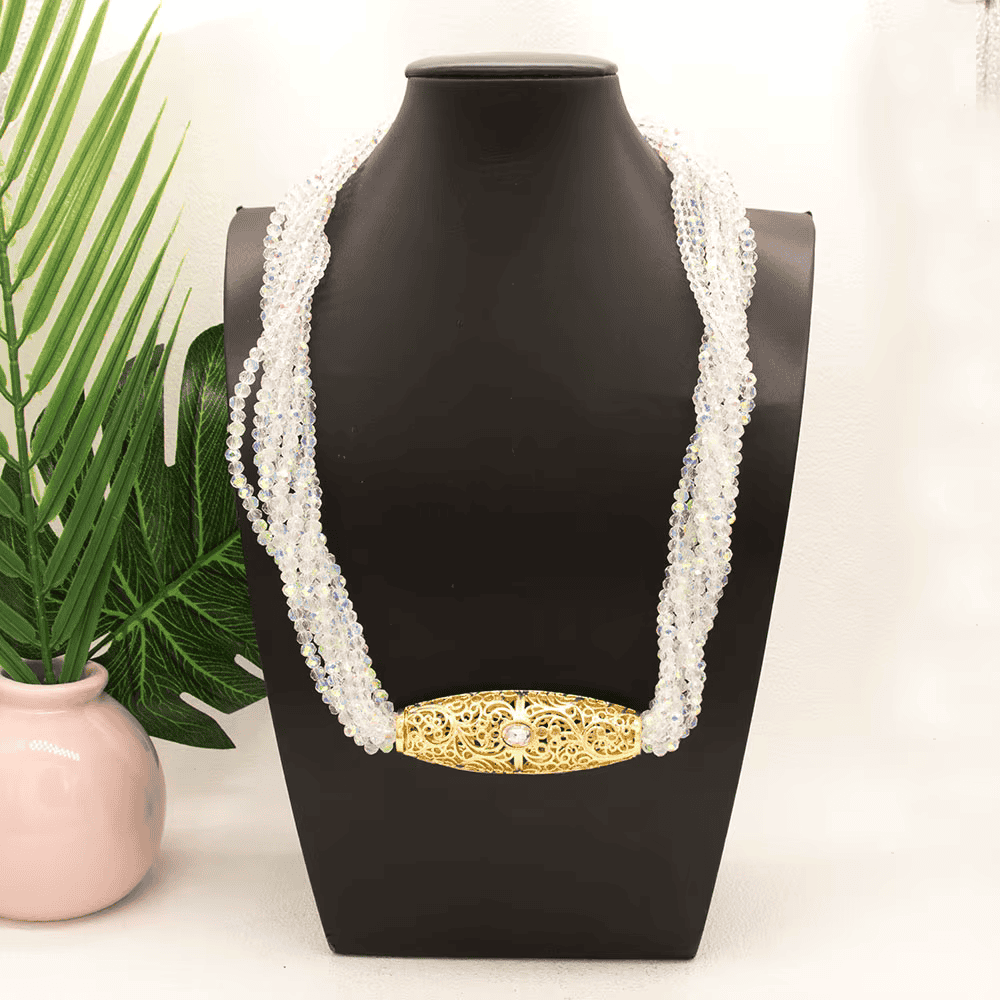 This women choker necklace follows a traditional Arabic and Moroccan inspired jewelry design that focuses on symmetry, shine, and ornamental detailing. The structure is built as a crystal choker that sits around the base of the neck while extending slightly through a beaded chain and pendant arrangement. Round crystal rhinestones are placed along a gold color metal structure that reflects light from different angles. This placement helps the necklace maintain visual balance while creating a noticeable decorative effect.