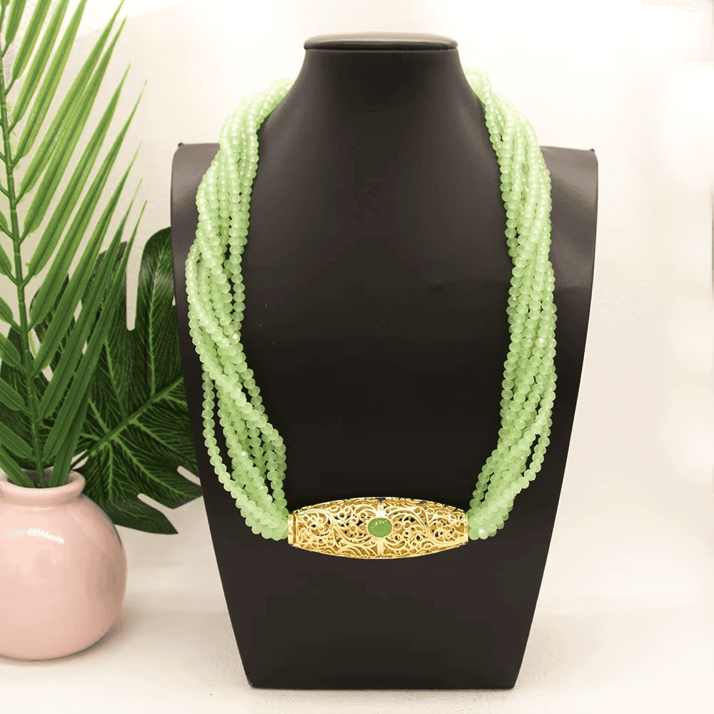 The beaded chain adds another decorative layer. Instead of a plain chain, the bead pattern introduces rhythm and visual texture. This combination of crystals, gold tone metal, and ethnic detailing creates a necklace that focuses on visual richness and balanced symmetry.