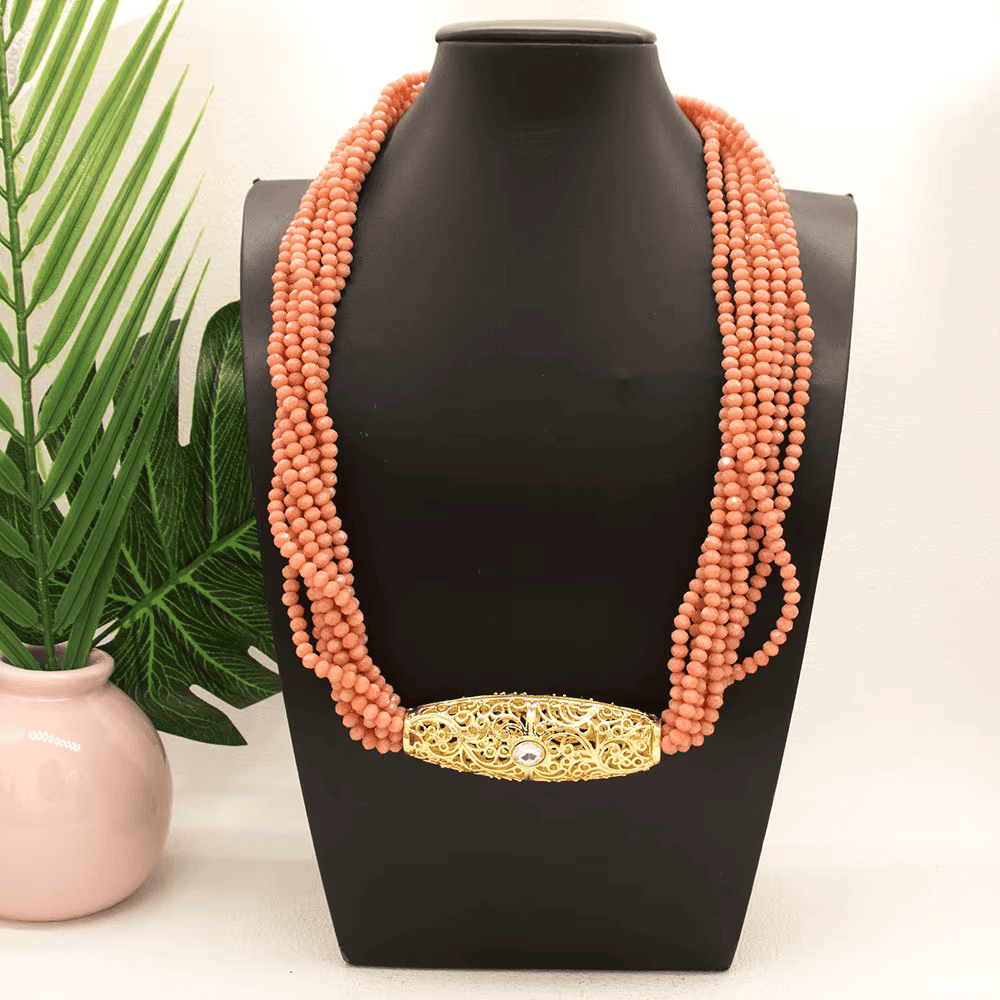 Gold colored jewelry is also commonly worn during celebrations in many cultures. In Moroccan and Middle Eastern traditions, gold accessories are often worn during weddings and family ceremonies. The color and structure of the necklace reflect that cultural preference.