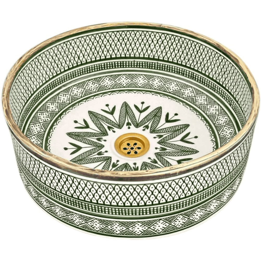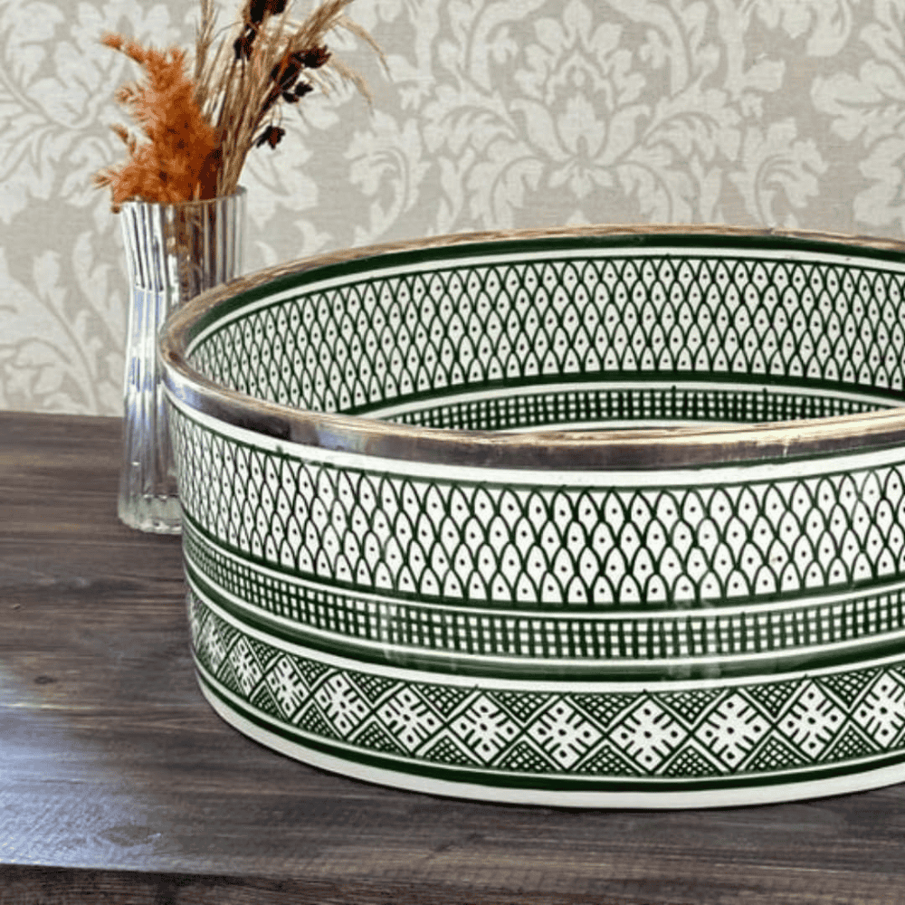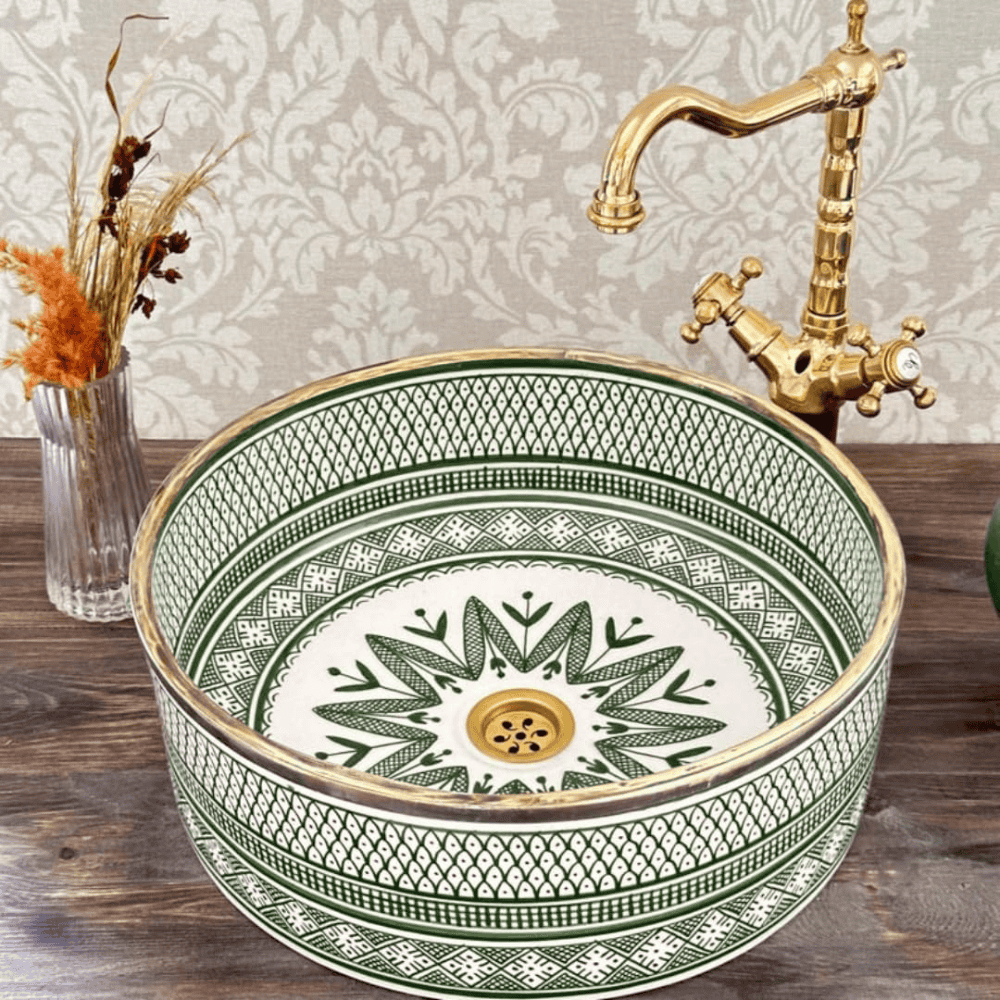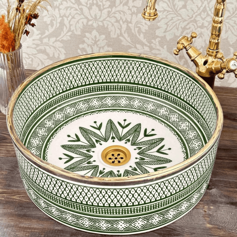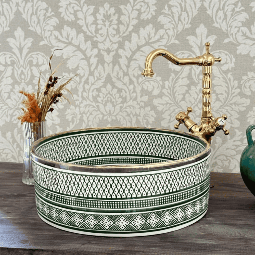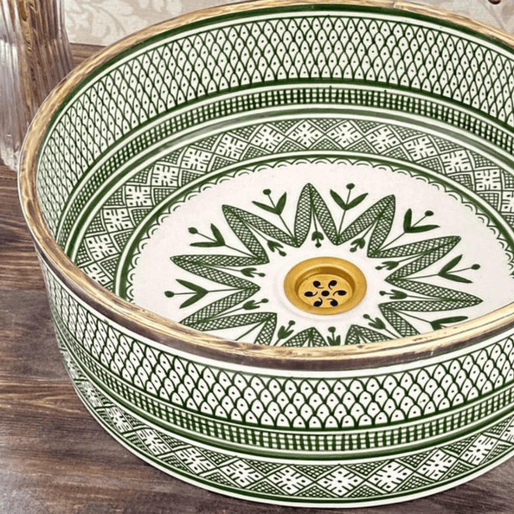 This handmade Moroccan ceramic vessel sink is crafted by skilled artisans who rely on traditional pottery methods passed down through generations. Each sink is carefully shaped, fired, and glazed by hand, making every piece slightly different and unique. The irregularities in the glaze, shape, and pattern are intentional and give the vessel an authentic character. This type of craftsmanship reflects a slow, deliberate process that prioritizes precision and heritage over mass production.