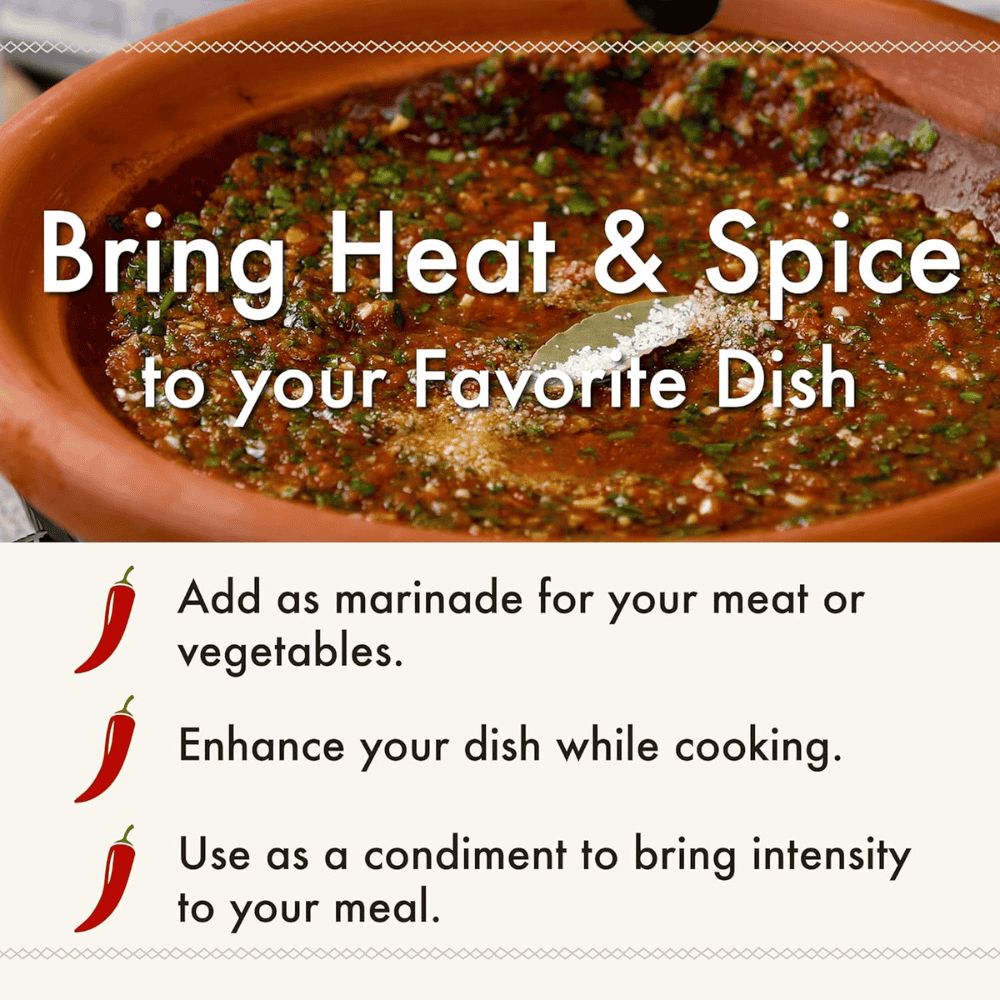 Moroccan chili peppers provide warmth that builds gradually rather than producing an immediate burning sensation. This makes the sauce more suitable for cooking because the spice level remains manageable.