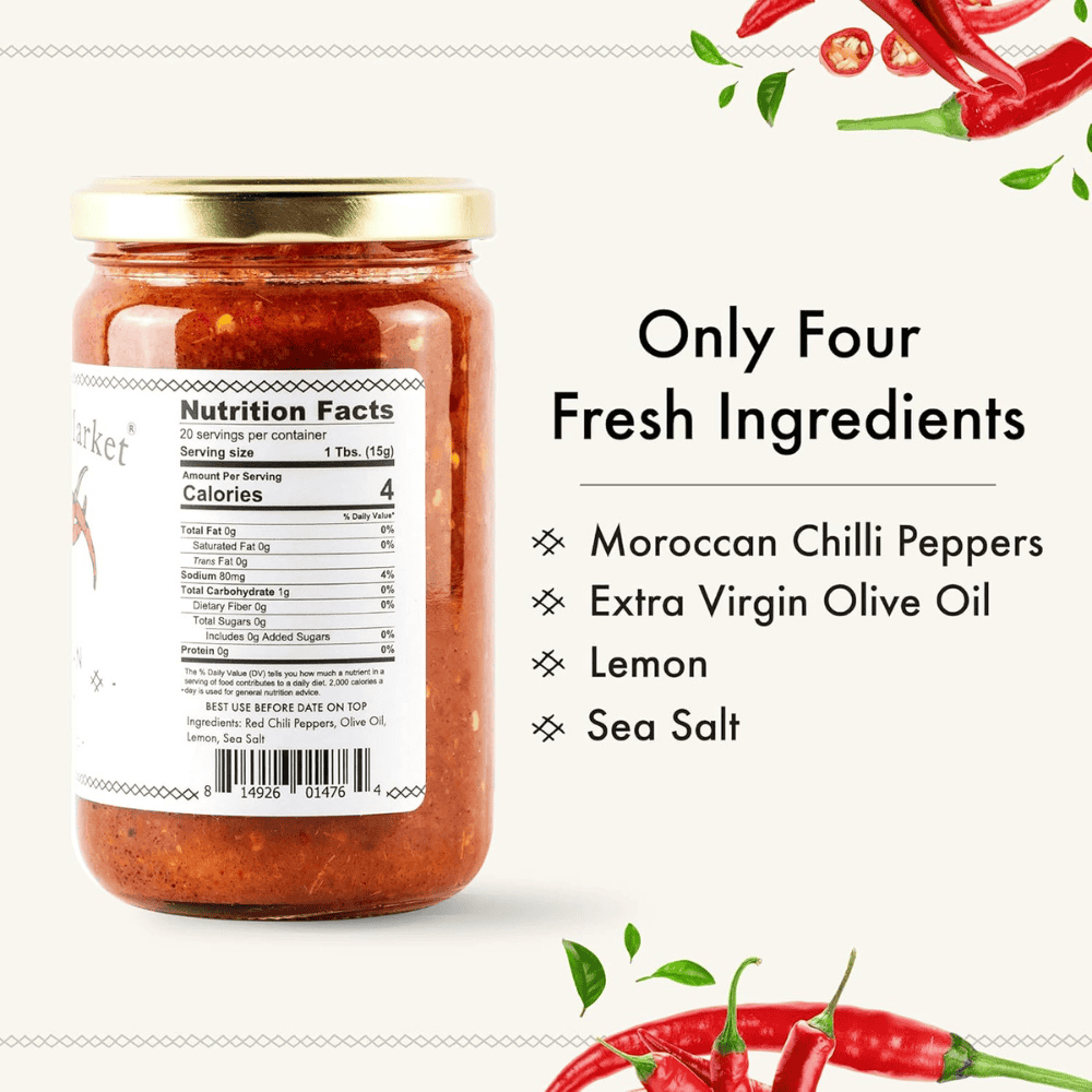 The ingredient composition focuses on simple components. Moroccan chili peppers provide the dominant flavor profile, while olive oil contributes richness and smoothness. Sea salt enhances the natural flavor of the peppers, and lemon introduces light acidity that balances the heat.