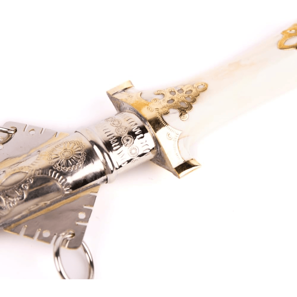 The black bone handle creates contrast with the metal blade and scabbard. It is shaped by hand, resulting