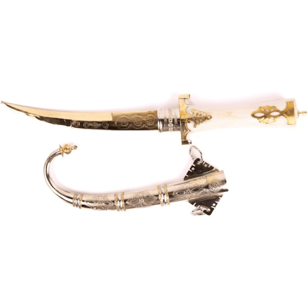 blade-to-handle ratio follows traditional jambiya proportions, while the scabbard fully covers the blade