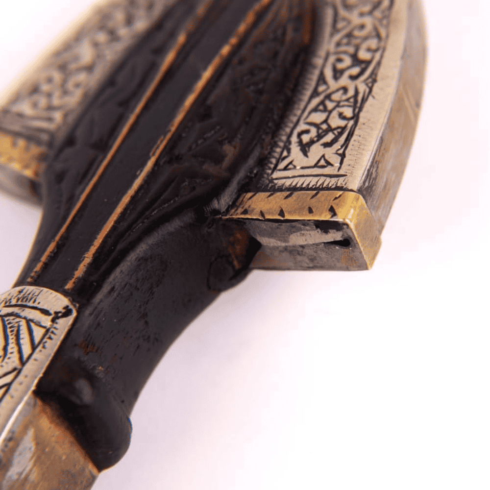 The blade feels solid due to its thickness, while remaining visually balanced. Its curvature follows classic Koummya proportions rather than modern knife ergonomics, which is important for collectors seeking historical accuracy. Maintenance is simple and limited to light cleaning with a dry cloth. This combination allows the blade to retain its appearance over time without demanding specialized preservation.