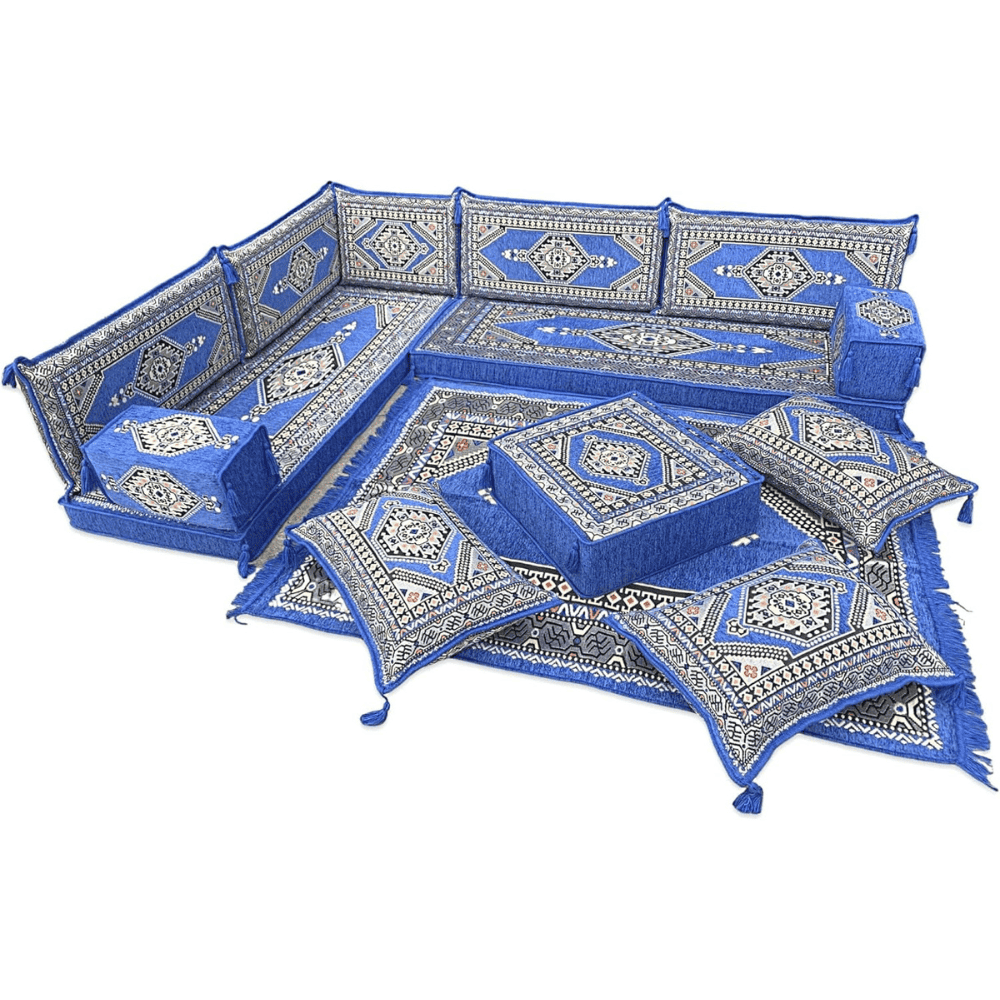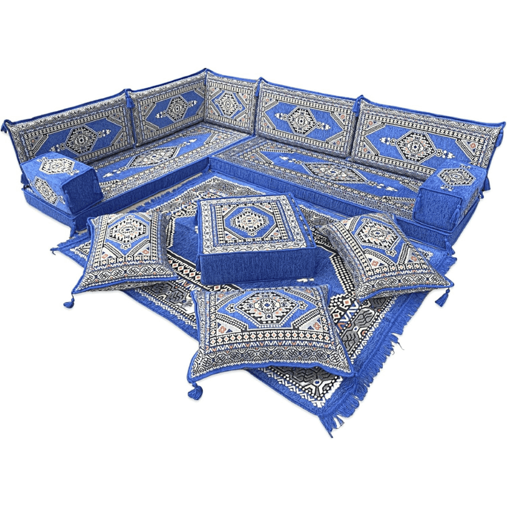 The full set contains multiple coordinated pieces designed to work together as a complete seating solution. It includes 2 floor seating couches, 5 backrest pillows, 2 armrest pillows, 3 floor pillows, 1 ottoman, and 1 rug. Each piece has its inner foam filling, so no separate inserts are required.