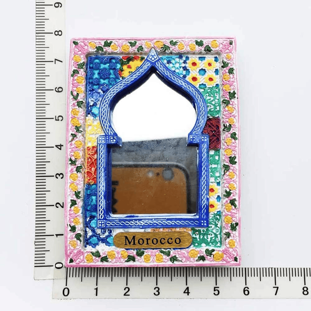 This Morocco 3D carving fridge magnet represents a visual memory rather than a simple decorative object. The round shape and raised relief design reflect architectural and ornamental patterns commonly found in Moroccan mirrors and traditional interiors. Made from resin, the magnet allows fine carving details that flat printed souvenirs cannot reproduce. This material choice supports depth, texture, and long-term color stability. The strong magnet fixed on the back provides stable attachment to metal surfaces, which keeps the item functional beyond decoration. As a travel souvenir, it serves a clear purpose: it records a place visited and turns that memory into a daily visual reminder. The combination of cultural reference, three-dimensional structure, and compact format creates a balanced souvenir that fits easily into luggage while still feeling substantial. The result is a small object that connects memory, place, and use in a practical way.