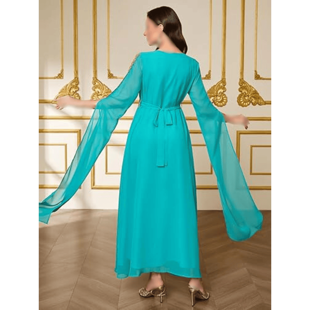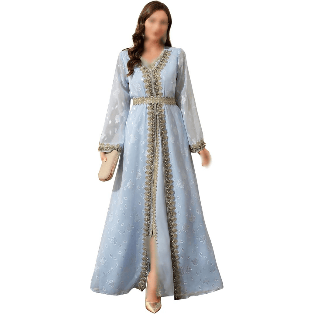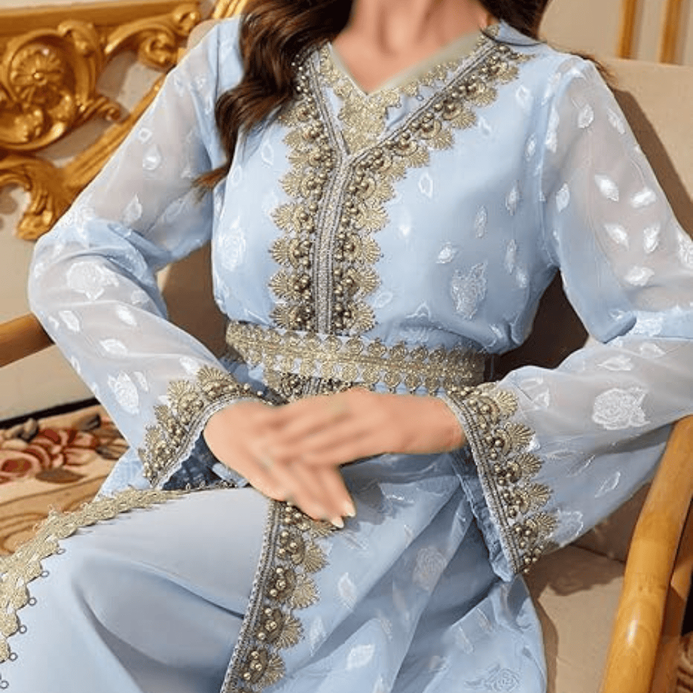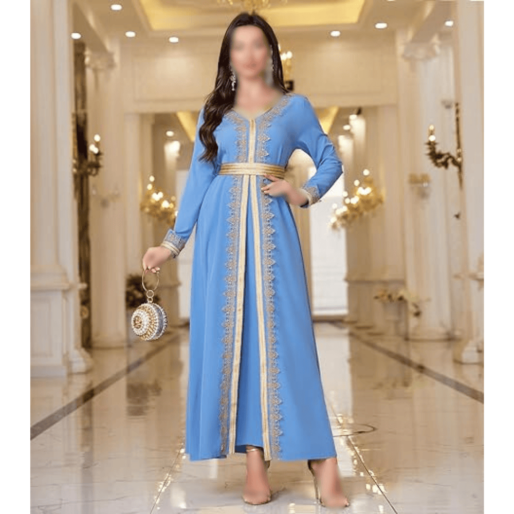 The abaya is available in Light Blue, Turquoise Green, Black, Blue, and Champagne. Light shades work well for daytime events, while deeper colors suit evening and formal occasions. Champagne adds a warm, elegant tone that pairs naturally with gold embroidery.